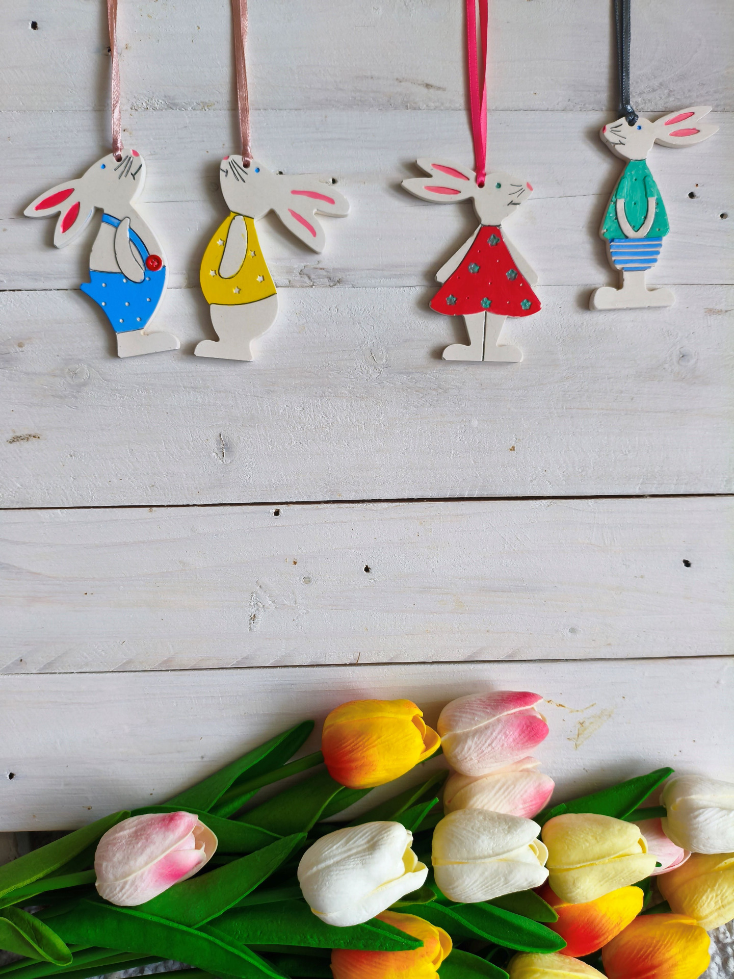 Egy oldalon, kézzel festett nyuszi függődíszek.